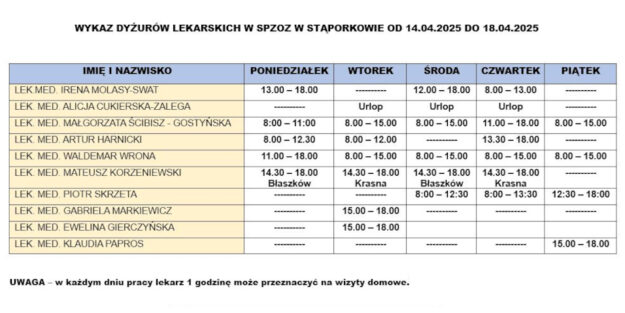 Wykaz dyżurów lekarskich w SPZOZ w Stąporkowie od 14.04.2025r. do 18.04.2025r.