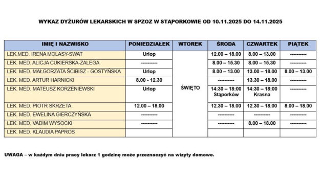 Wykaz dyżurów lekarskich w SPZOZ w Stąporkowie od 10.11.2025r. do 14.11.2025r.