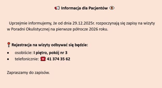 Zapisy na wizyty w Poradni Okulistycznej na pierwsze półrocze 2026 roku
