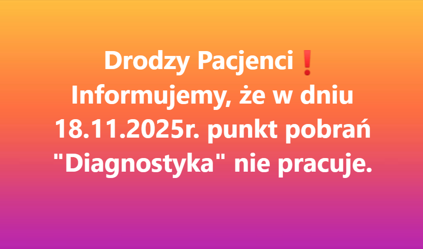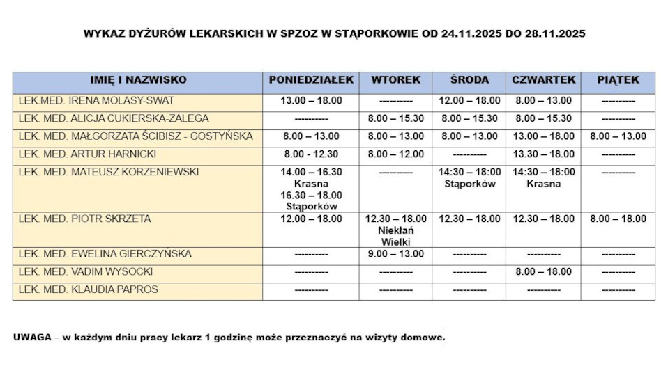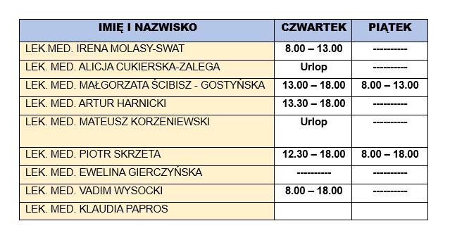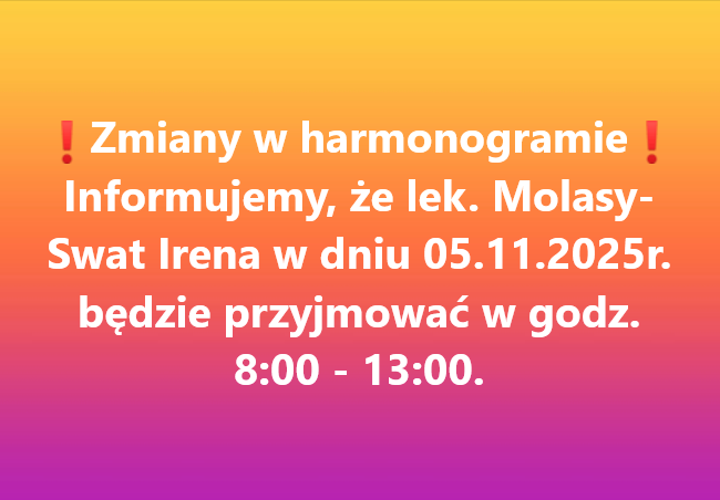 Zmiany w harmonogramie Ze względu na trwające prace remontowe w Ośrodku Zdrowia w Błaszkowie, lek. Korzeniewski Mateusz w nadchodzącym tygodniu będzie przyjmował pacjentów w Ośrodku Zdrowia w Stąporkowie (poniedziałek i środa) oraz Ośrodku Zdrowia w Krasnej (poniedziałek i czwartek). Prosimy o wyrozumiałość i przepraszamy za wszelkie niedogodności związane z tymczasową zmianą miejsca przyjęć.