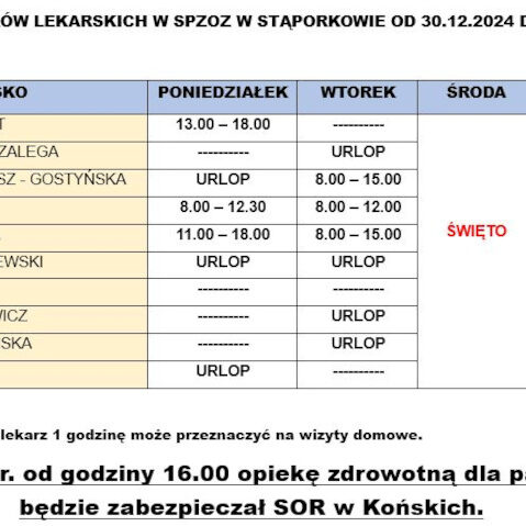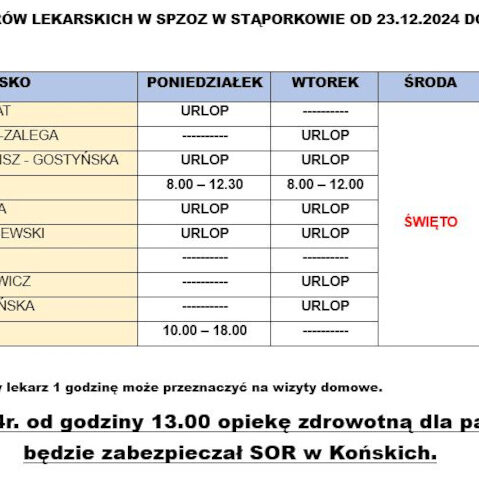 SzczegółyDrodzy Pacjenci! Informujemy, że w dniu 24 grudnia 2024 r. (Wigilia) nasza przychodnia czynna będzie do godziny 13.00. Po tej godzinie pacjenci potrzebujący porady lekarskiej będą mogli skorzystać z konsultacji lekarskich w Zespole Opieki Zdrowotnej w Końskich ul. Gimnazjalna 41 B