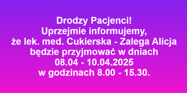 Inne godziny przyjęć – lek. med. Cukierska -Zalega Alicja