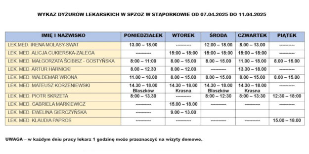 Wykaz dyżurów lekarskich w SPZOZ w Stąporkowie od 07.04.2025r. do 11.04.2025r.