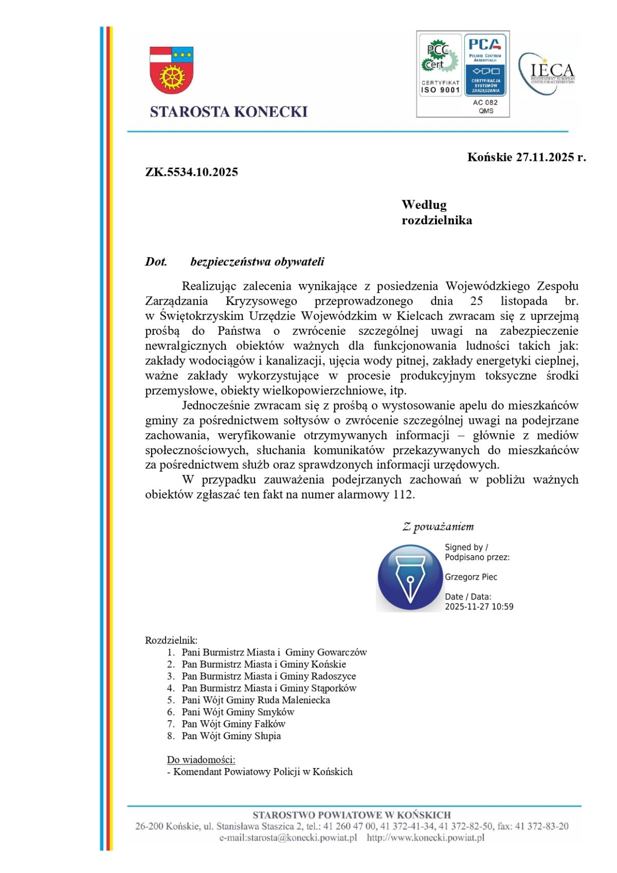 W związku z zaleceniami Wojewódzkiego Zespołu Zarządzania Kryzysowego prosimy o zwrócenie szczególnej uwagi na bezpieczeństwo newralgicznych obiektów na terenie naszej gminy, m.in. ujęć wody, stacji energetycznych, oczyszczalni, wodociągów, obiektów przemysłowych i wielkopowierzchniowych.