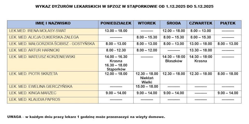 Wykaz dyżurów lekarskich w SPZOZ w Stąporkowie od 01.12.2025r. do 05.12.2025r.