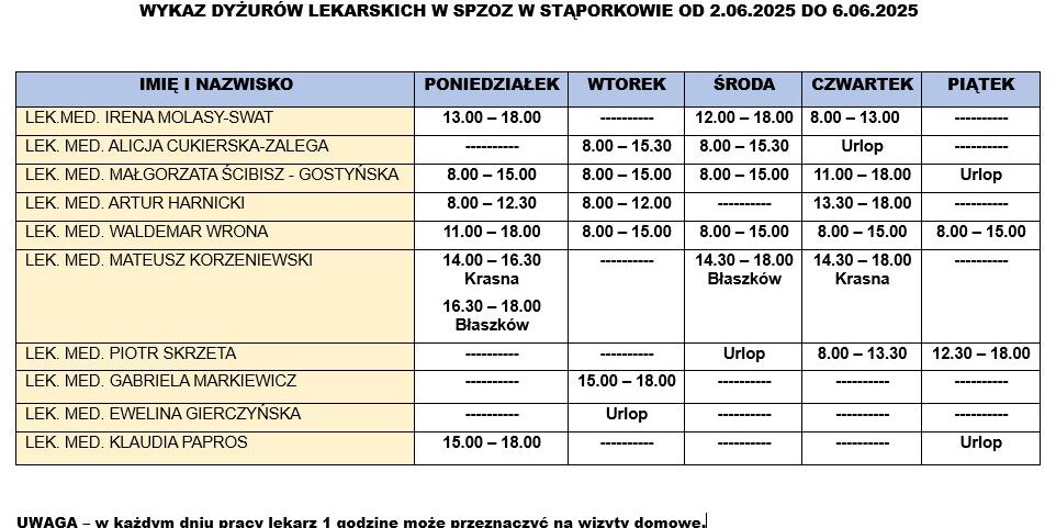 Wykaz dyżurów lekarskich w SPZOZ w Stąporkowie od 02.06.2025r. do 06.06.2025r.