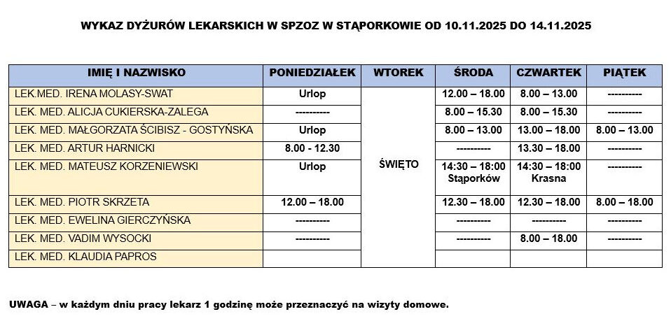 Wykaz dyżurów lekarskich w SPZOZ w Stąporkowie od 10.11.2025r. do 14.11.2025r.