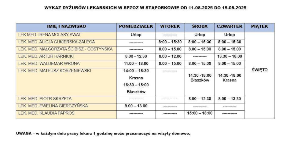 Wykaz dyżurów lekarskich w SPZOZ w Stąporkowie od 11.08.2025r. do 15.08.2025r