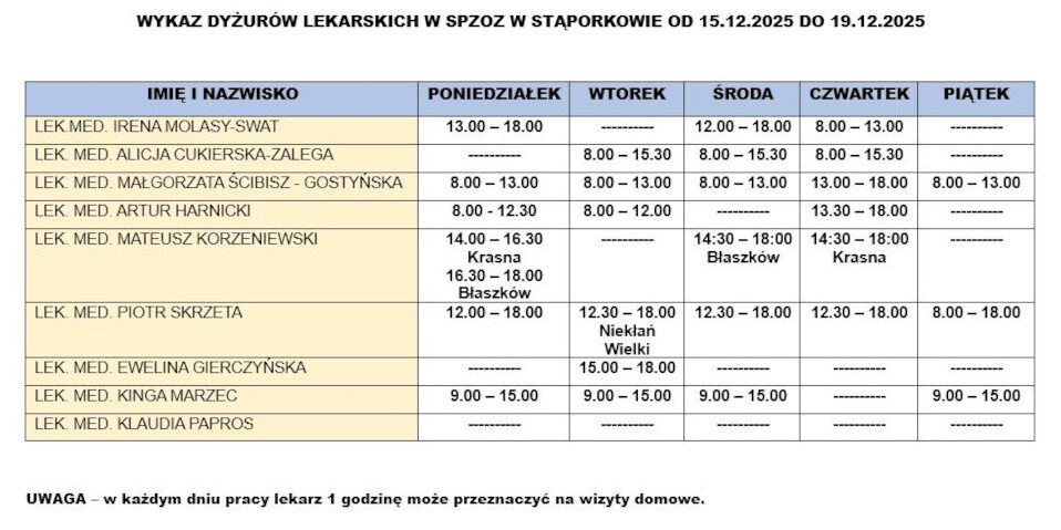 Wykaz dyżurów lekarskich w SPZOZ w Stąporkowie od 15.12.2025r. do 19.12.2025r.