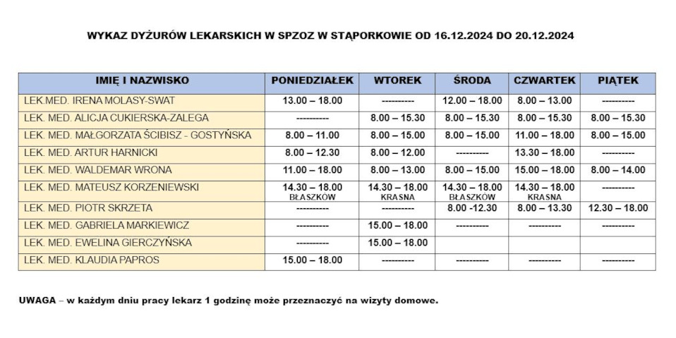 Wykaz dyżurów lekarskich w SPZOZ w Stąporkowie od 16.12.2024r. do 20.12.2024r.