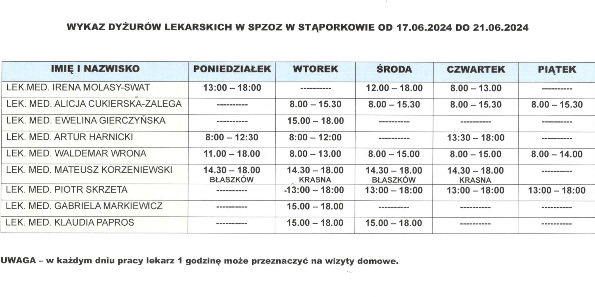 Wykaz dyżurów lekarskich w SPZOZ w Stąporkowie od 17.06.2024r. do 21.06.2024r.