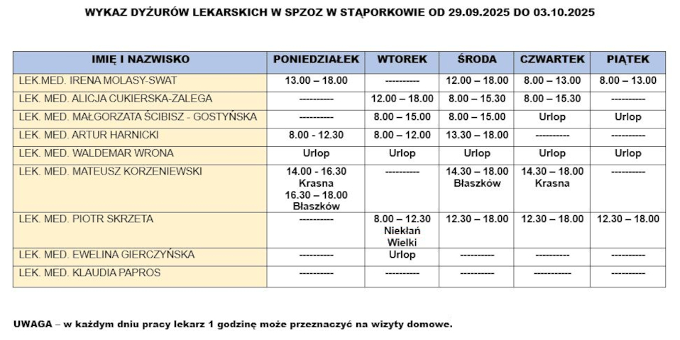 Wykaz dyżurów lekarskich w SPZOZ w Stąporkowie od 29.09.2025r. do 03.10.2025r. – aktualizacja